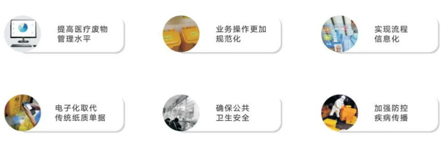 条码化管理,动态追踪医疗废弃物的状态及数量变化,及时发现问题并溯源,有效控制医疗废弃物非法外流。