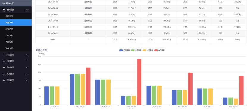 录入详情:医废录入完成后,点击操作界面上的【查看详情】选项,进入医废录入详情界面,工作人员可以查看当日录入的医废信息,包括医废袋编号、医废种类、产生科室、个数、重量、录入时间以及医废袋总数量和总重量等。